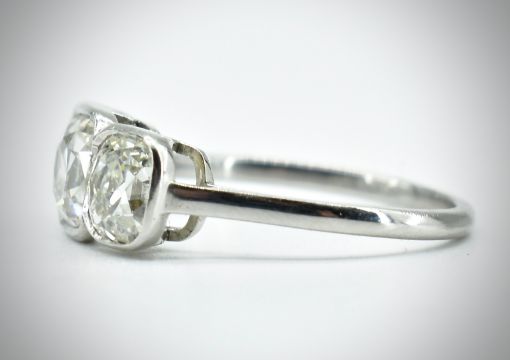 A platinum and diamond three stone ring. The ring having three collet set old cut diamonds having a pierced gallery to plain shank.  Principle diamond measures approx 6.2mm x 5.7mm x 4mm. Estimated total diamond weight 2.5ct.  Estimated colour and clarity H-I / VS. Marked PT and partial sponsor mark. Weight 3.19g. Size M