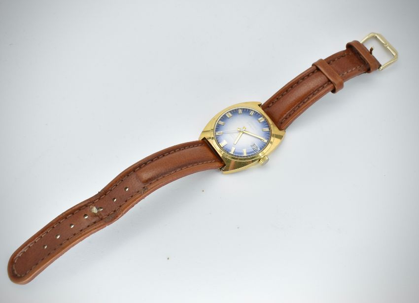 A mid century Gigandet Automatic 25 Rubis Incabloc gentleman's wristwatch / watch. The blue tone dial with luminous baton numeral chapter ring and luminous dagger hands having date aperture centre right. Inset swiss movement. Reset to a new brown leather strap. Serial 11 8 09
