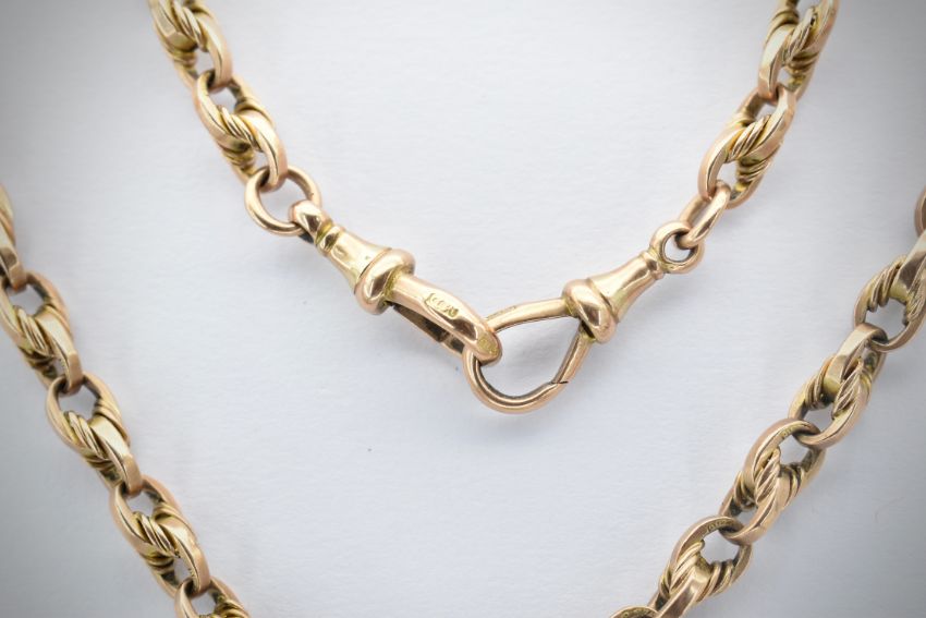 A Victorian 19th century 9ct gold Albert Chain set with an armorial fob stamped for 1913 being hallmarked 9ct gold. Each link being stamped 9ct / 375. Set with a t-bar and twin c-clasps at each end. Total weight 44.93g / Length 43cm