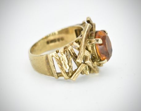A 9ct gold and citrine hallmarked 1960's designer ring. The central oval facet cut  citrine within crossover sticks mount to a tapering shank. Sponsors mark HB. Hallmarked London, date letter O for 1969. Total weight 5g / Size K