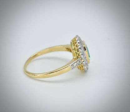 An 18ct gold emerald and diamond ring. The ring set with an octagon mixed cut emerald, framed by rose cut diamonds having rose cut diamond set shoulders to tapering shank. Unmarked tests indicate 18ct gold. Weight 3.2g. Size M.5.