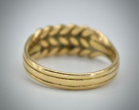 A Victorian 18ct gold hallmarked keeper ring. The believed Chester ( partially rubbed ) hallmarked ring with woven front having reeded shank. Hallmarked  and with Rd No 221797 for 1893 /1894 . Size O.5 / Weight 4.51g