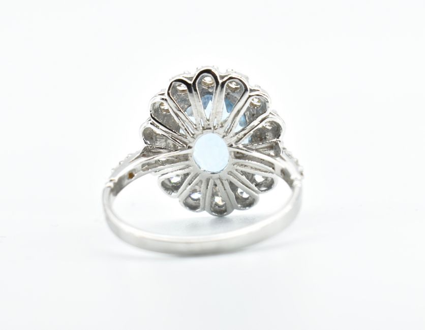 An 18ct white gold aquamarine and diamond cluster ring. The ring set with a central oval mixed cut aquamarine framed by a halo of round brilliant cut diamonds to diamond set shoulders and plain shank. Marked 18K tests indicate 18ct carat gold. Weight 4.48g. Size P.