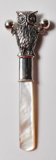 A white metal babies rattle in the form of a owl flanked by bells and faux mother of pearl teether below. Measures 9.5cm Gross weight 13.2g