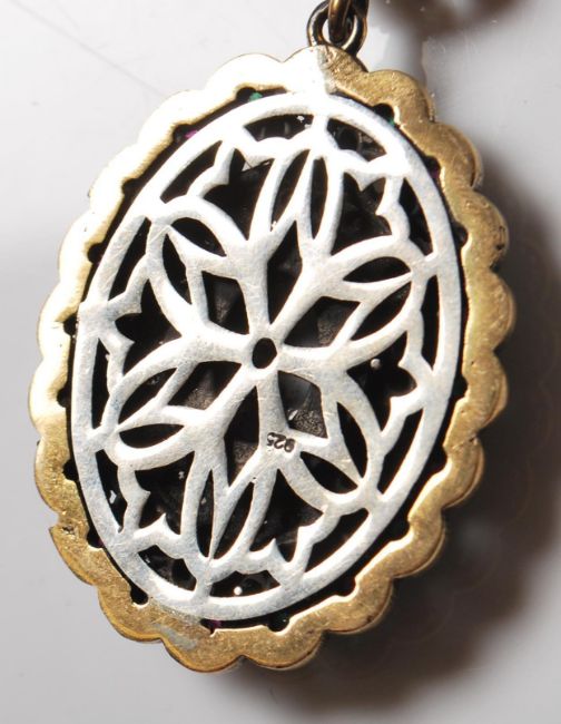 A stamped .925 sterling Victorian style silver pendant necklace having a central enamel panel decorated with Queen Victoria surrounded by red and green stones. Necklace has a.925 sterling silver chain. Length 44cm