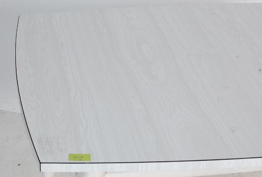 A retro vintage mid 20th Century formica top dining / kitchen table of simple rectangular form having a white formica top. Raised on white painted beech Ercol style frieze and splayed tapering leg supports. Measures 74cm x 107cm x 69cm.