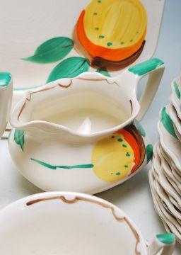 An Art Deco early 20th century 1930s Myott tea service comprising of cups, saucers, creamer jug and more. Stamped to the base