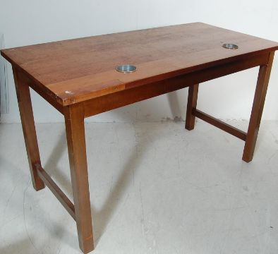 A vintage late 20th century school science lab table with solid pine top and frame raised on square legs united by peripheral stretchers. Perfect for a kitchen island / breakfast bar.