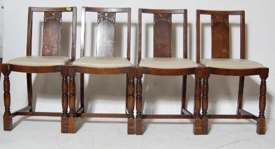 A set of four vintage 1950s mid century oak Ercol dining chairs having carved backrests with over drop in seats raised on drop in seats united by h stretchers. Comes with a vintage oak drop leaf dining table. Ercol label to the base H74cm x W89cm x D41cm