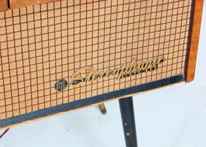 A retro vintage 1960s Pye Stereophone Black Box vinyl LP record player audio Hi Fi system having a 210 Garrard deck set with a walnut veneer case raised on dansette legs. H63cm x W135cm x D53cm