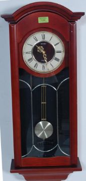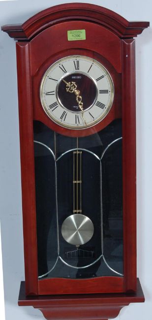 A vintage late 20th century Venetian style 8 day wall clock having Seiko electronic movement, yellow face with Arabic numeral to the chapter and mahogany colour case. 73cm x 33cm x 12cm