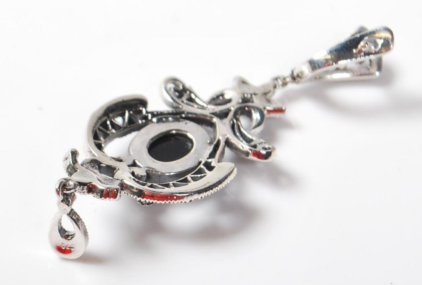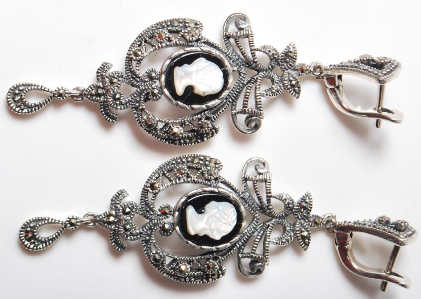A pair of Renaissance style white metal earrings having marcasite decoration with a cameo of a lady in profile. Measures 7cm