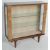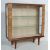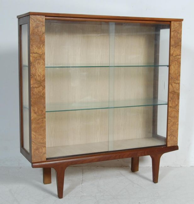 A retro 1950's melamine / formica china display cabinet vitrine having dansette legs with twin glass sliding doors and glass shelves H98cm x W92cm x D29cm