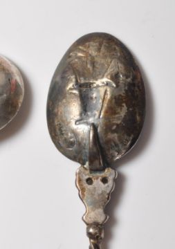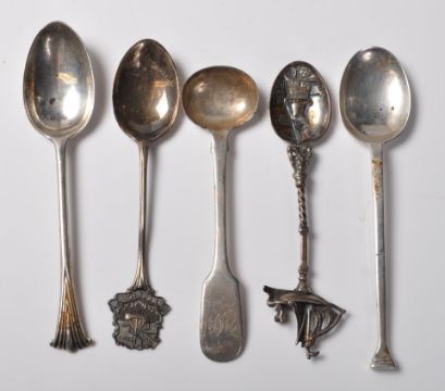 A group of three various antique silver spoons to include a John Aldwinckle & Thomas Slater late Victorian teaspoon with a scrolled terminal (hallmarked London 1886), a Keswick souvenir spoon (hallmarked Birmingham 1938),  teaspoon with rectangular handle and terminal (hallmarked Birmingham 1915), a silver whiter metal mustard spoon and a silver white metal Dutch souvenir spoon. Total weight 54g. 11cm long