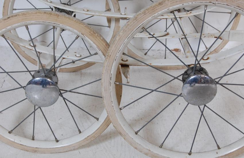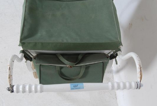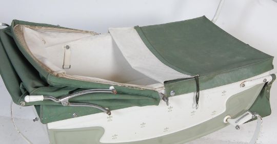 A vintage retro 20th Century Silver Cross children's dolls pram finished white with fleur de lis motifs to the sides, and green upholstery. The hooded pram raised on a chrome base and white wheels.Measures, 70 cm H x 96 cm W x 41 cm D