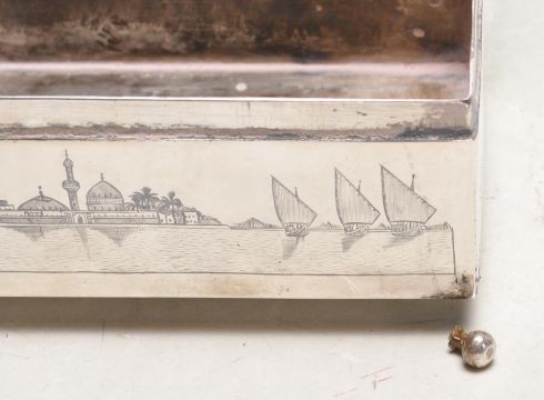 An early 20th century Middle Eastern / Arabic silver box / cigarette box of a rectangular form with hinged lid with hand painted Middle East scenes and signed to the top right corner by the artist, raised on ball feet. No hallmarks but tests indicates silver. 5cm high x 14cm length x 8cm deep