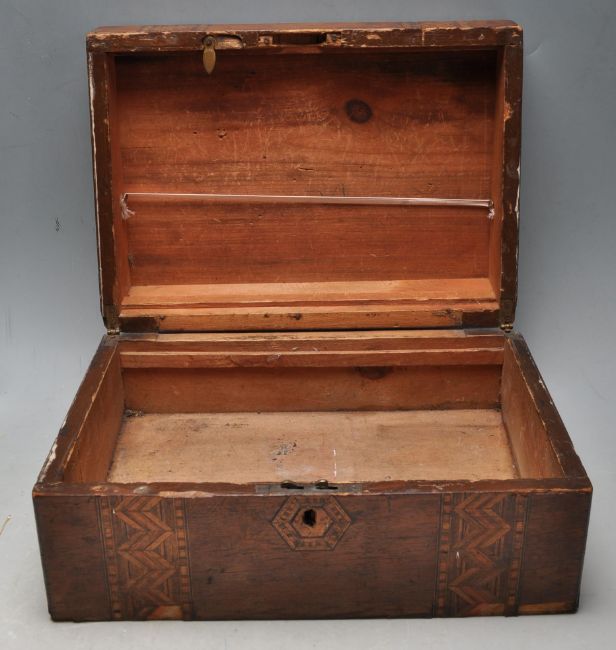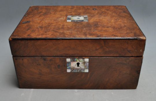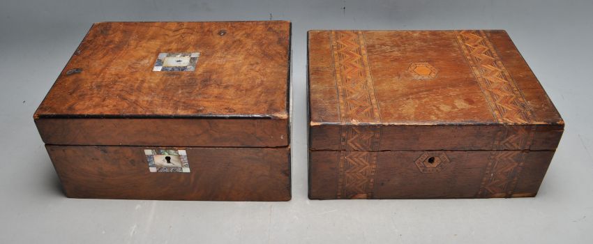 A 19th century Victorian wooden writing slope box having inlaid marquetry to the top. together with a walnut tea caddy of rectangular form with inlaid mother of pearl and abalone to the top and side. Measures 13 x 30 x 21 cm.