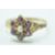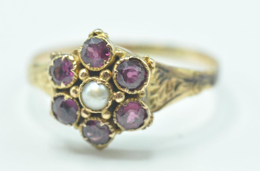 A 19th Century Victorian ring having a flower head set with a central pearl surrounded by six round cut garnets with engraved shoulders. Weight 1.8g. Size O.5.