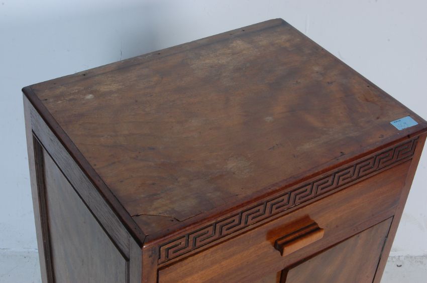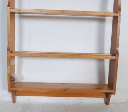 A mid century Heals manner limed oak chest of drawers. Raised on squared legs with a bank of 3 drawers having pull handles with flared edge top above.  Together with a mid century oak cupboard with short drawer, whicker basket hamper, whicker chair and a Victorian style pine hanging bookcase / set of shelves Measures 77 cm H x 77 cm W x 45 cm D