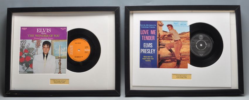 Two framed Elvis Presley EP 45 single vinyl records to include The Wonder of You / Mama Liked the Roses RCA 47-9835 and Love Me Tender RCA 45 RCX 7191. Each mounted with titles and dates in black frames. Measures 33 x 43 cm.