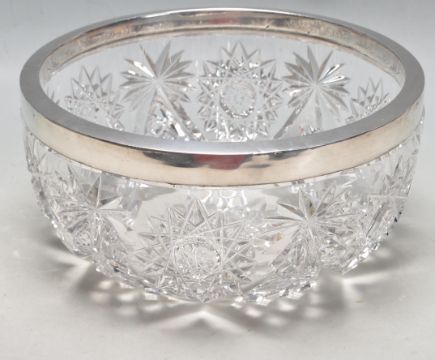A large 1920’s silver and crystal cut glass fruit bowl decorated with geometrical floral motifs and silver collar. Silver Birmingham hallmarks dated 1922 by John Grinsell & Sons. 21cm diameter