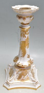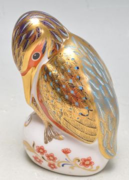 A large pair of 1960’s Royal Crown Derby fine bone china candlesticks having single sconce, tapered column raised on a square plinth base with embossed dolphin to the corners being decorated in the gold Aves pattern. Makers stamp to the underside dated 1962 together with a Royal Crown Derby kingfisher paperweight with silver stopper dated 1996.