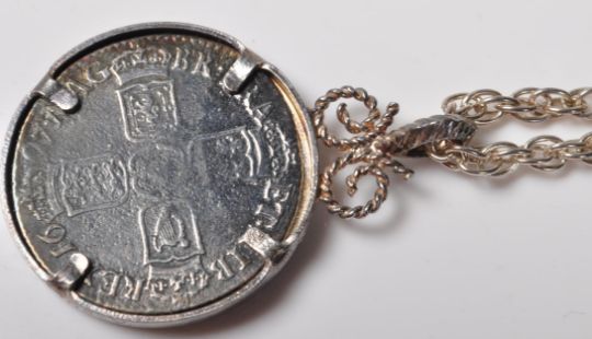A reputed William III shilling set within a white metal necklace from the wreck site of the English flagship 'The Association' (sunk 1707). Complete with presentation box and certificate.