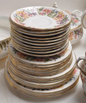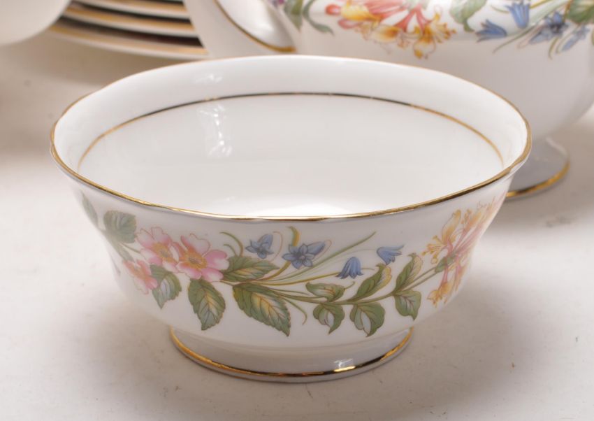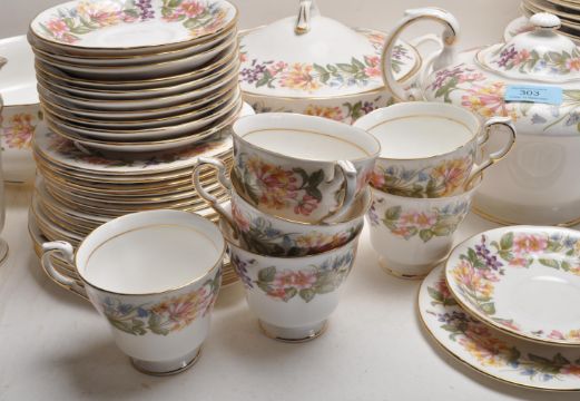 A large 20th Paragon Country Lane pattern dinner service / dinning set to include large oval platter, large central bowl, tureen, milk jug, water jug, eight soup bowl, six large bowls, ten large plates, teapot, nine cups eleven saucer, eight cake plates, etc. All with makers mark underside 41cm x 31cm