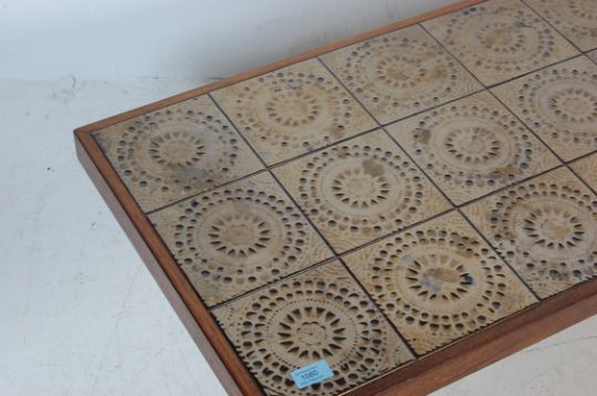 A retro vintage tile topped coffee / occasional table in the manner of Merrow Associates. The rectangular coffee table having studio pottery tiles atop of chrome supports with castors beneath. Measures 35 cm H x 110 cm W x 49 cm D