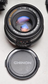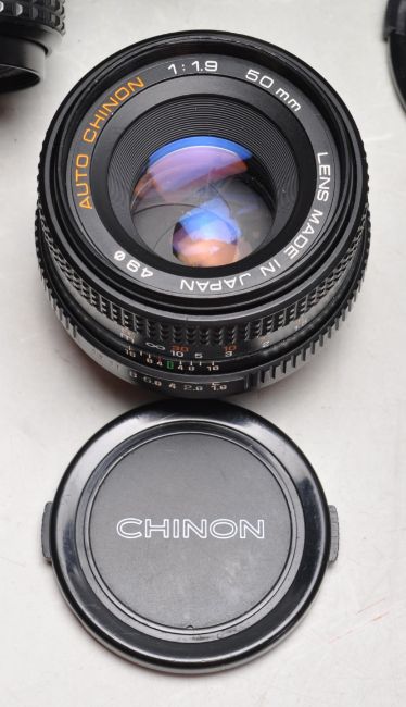 A collection of vintage camera equipment to include a A Chinon CE-4 automatic 35mm SLR camera, Pentax 28mm lens, Tefnon 28-80mm lens, Miranda 70mm-120mm, Auto Chinon 50mm and a Miranda 630CD flash, tripod, light measurer and more.