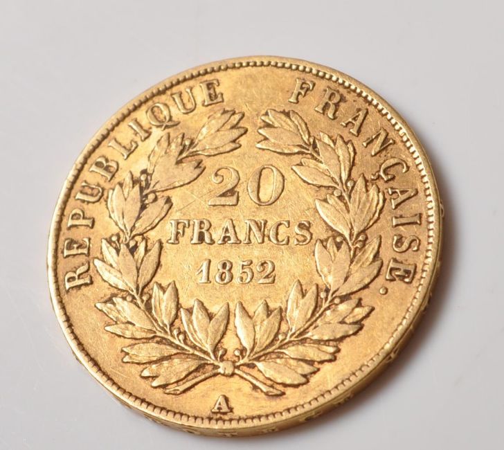 A 19th Century 1852 French gold Napoleon III 20 Francs coin having a Louis Napoleon Bonaparte bust facing right and wreath to verso with a Paris mint mark. Weight 6.4g. Measures 21mm.