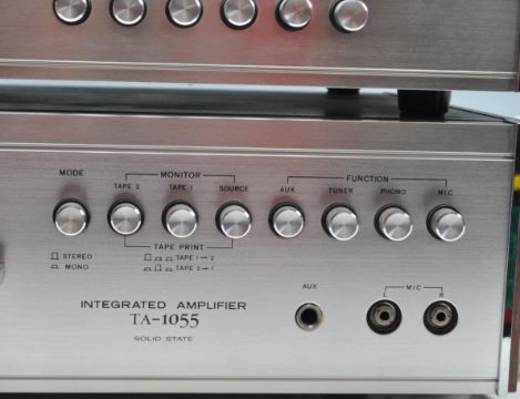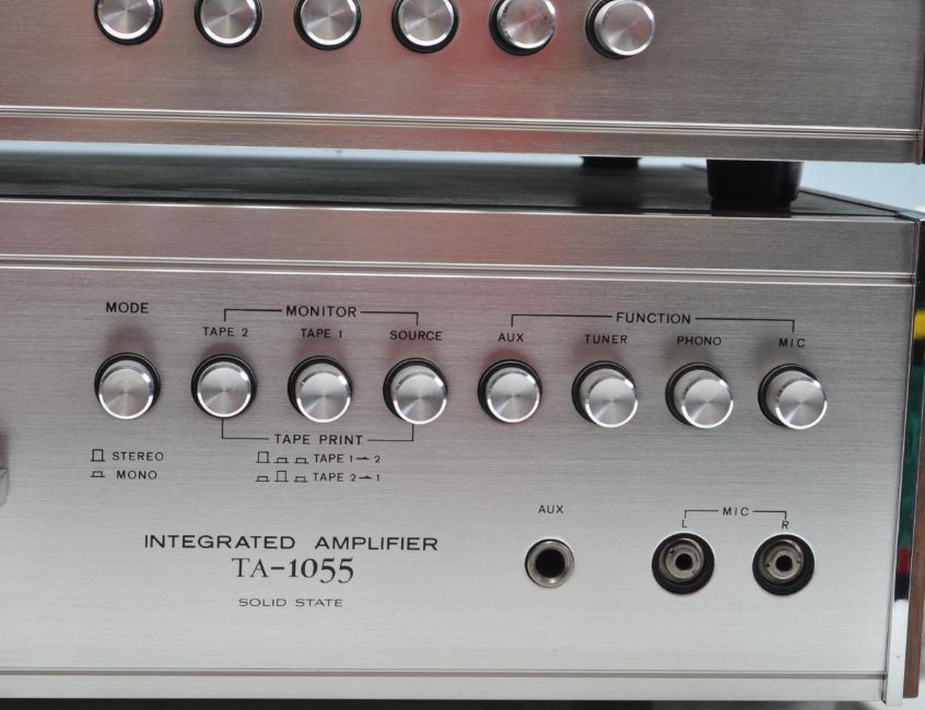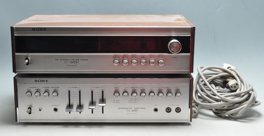 A vintage 1970s Sony stacking system / Hi-Fi system comprising of a Sony ST-5055L FM STEREO / FM-AM TUNER solid state and a Sony TA-1055 Integrate Amplifier solid state. Both having brushed aluminium front with silver plastic control buttons and sliding volume buttons fitted in a teak wood veneer case. Measures 12 x 41 x 25 cm.