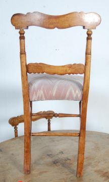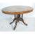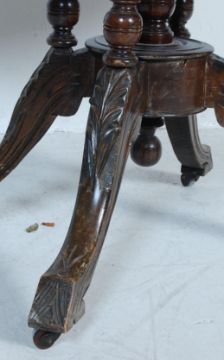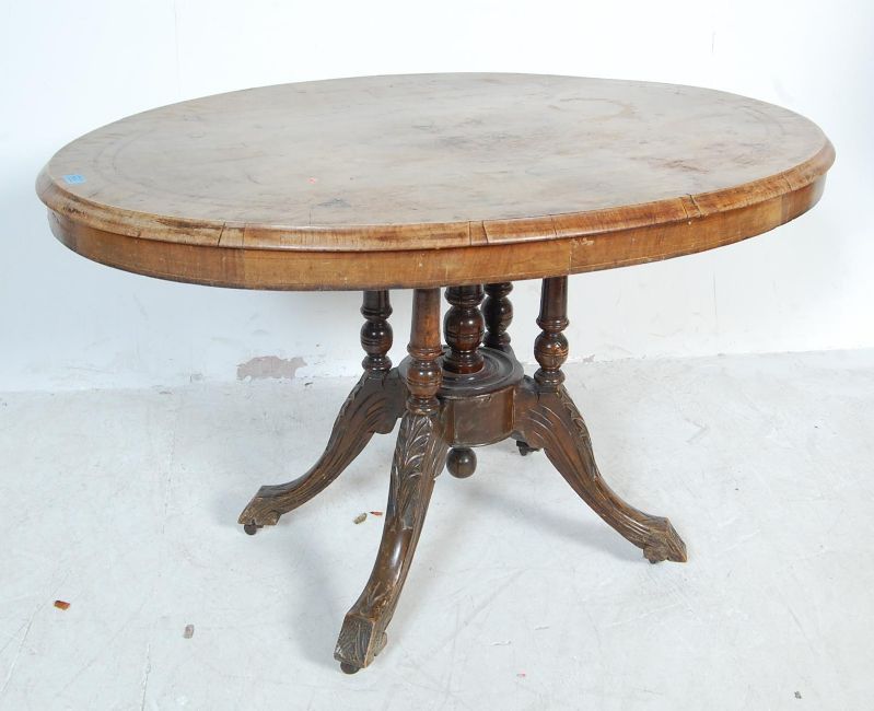 A 19th century Victorian mahogany inlaid tilt top table / occasional table having on oval top with inlaid decoration raised on a birdcage type base with carved column and splayed legs with casters together with four 19th century Victorian dining chairs with carved backrests, padded seats raised on shaped supports. Measures, 74 cm H x 115 cm W x 85 cm D