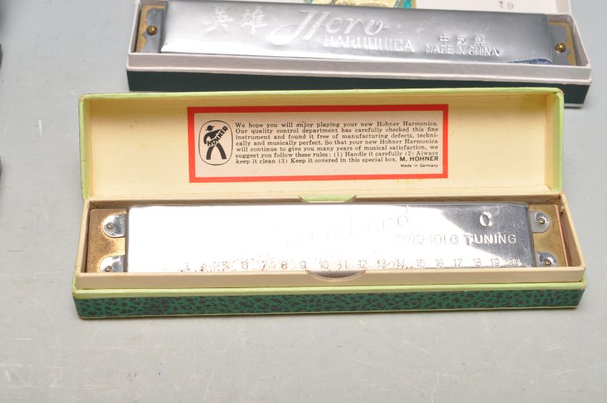 A collection of five German mid century and later Harmonica musical instruments to include makers as M. Hohner - Vest Pocket Harp, Echo Super Vamper, Song Band, Super Chromonica together with other two harmonicas.