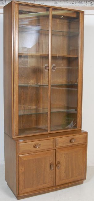 Ercol - Lucian Ercolani - An Ercol elm bookcase cabinet vitrine having twin glazed doors opening to reveal a shelved interior raised on a square base. The base having chamfered edges, twin drawers with circular pulls over a double door cabinet opening to reveal a shelved interior.Measures, 213 cm H x 92 cm W x 44 cm D