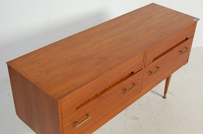 A vintage 1970”s teak wood  sideboard credenza of small proportions. The credenza having two blind fronted drawers over two deep brass handled drawers beneath. All raised on turned teak wood legs with brass cap feet. Measures, 65  cm H x 123 cm W x 40 cm D