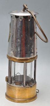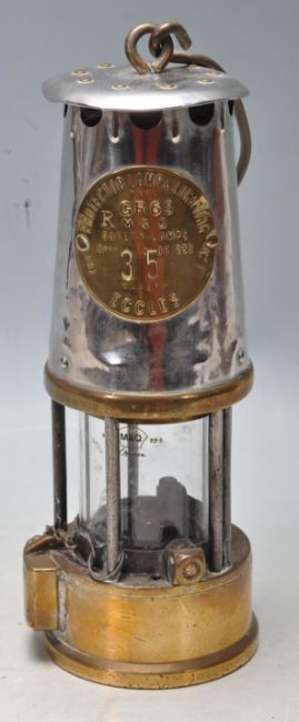 An early 20th century brass and metal miners lamp. Manufactured by The Protector Lamp & lighting Co Ltd. Type GR6S RM & Q safety lamps / Eccles. Hanging hook to the top.  Measures 27cm high.
