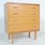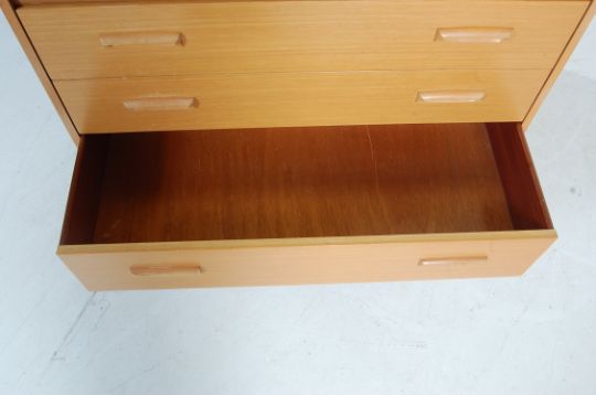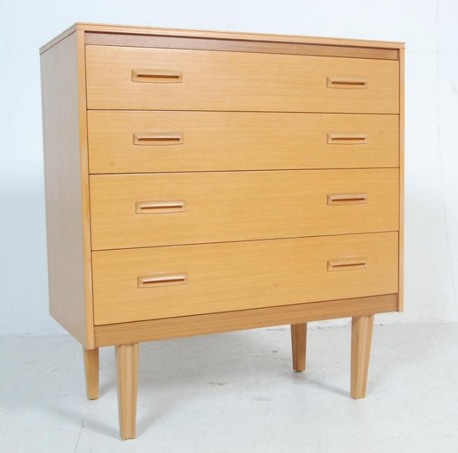 A 1970's retro 20th century retro light oak veneer chest of drawers. The chest of  rectangular form having four graduated drawers with recessed handles being  raised on tapered supports.Measures, 86 cm H x 78 cm W x 39 cm D