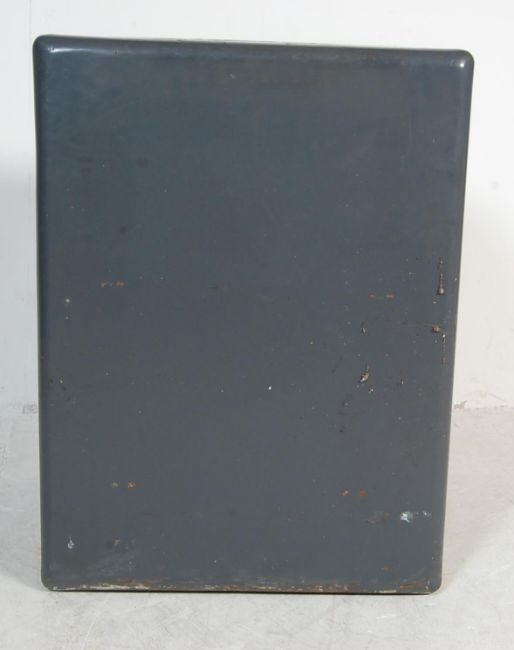 A mid century Industrial ‘Merlin’ heavy cast metal grey painted safe with inset drawer. Complete with key. Measures, 72 cm H x 53 cm W x 53 cm D