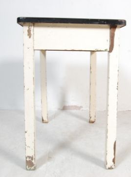 A vintage mid century enamel top kitchen table / dining table. The rectangular kitchen table having white enamel metal top and raised on square legs Measures, 74 cm H x 91 cm W x 51 cm D