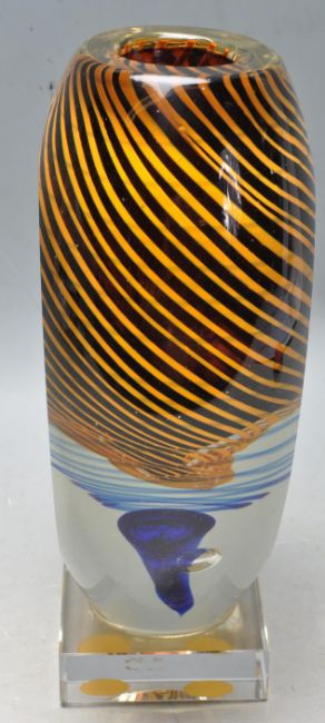 A retro vintage late 20th century studio art glass vase having a blue bubble base below a tornado swirl in orange and blue raised on a square base. 23cm high.