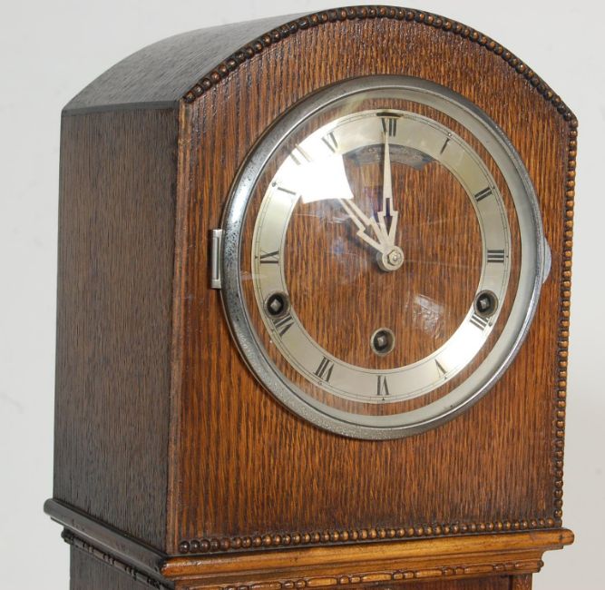 An Art Deco 1930's oak grandmother clock. The Art Deco case having a silvered chapter ring to the face and inset eight days brass chiming movement being set within good deco oak case with carved corners. Sold as untested.Measures, 127 cm H x 18 cm W x 15 cm D
