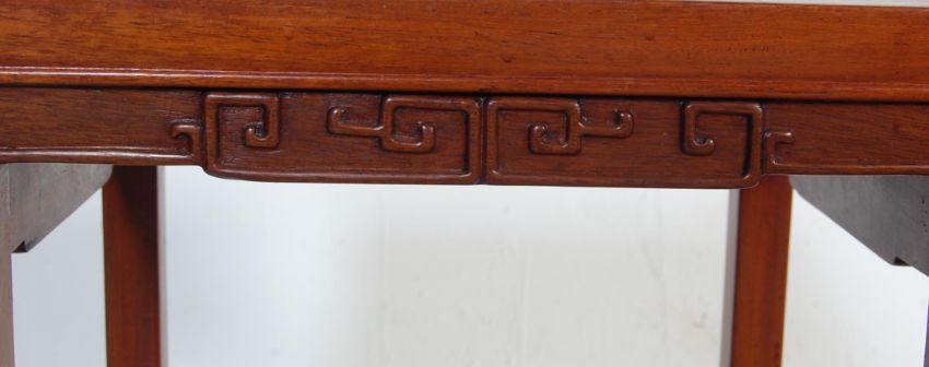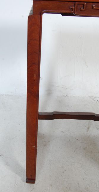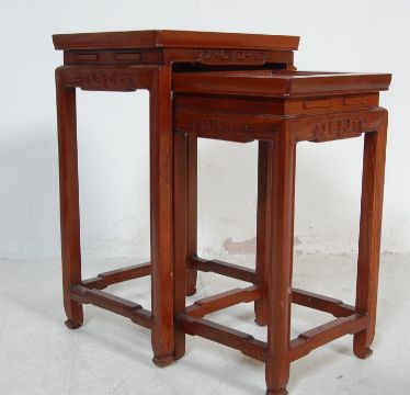 A 20th century Chinese hardwood opium style coffee table being raised on squared legs with a reeded edge frieze under table top above having similar decoration together with a near matched pair of Chinese nesting tables / nest of tables Measures, 41 cm H x 91 cm W x 91 cm D