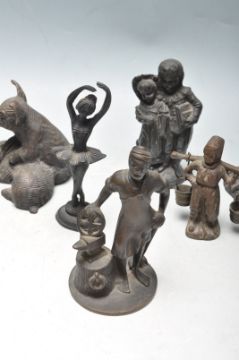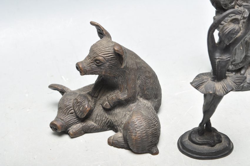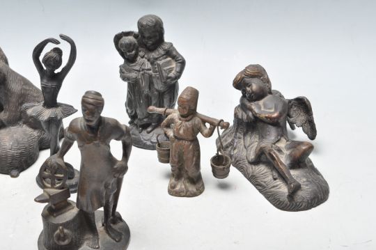 A collection of vintage 20th century brass and cast metal figures to include a large WWI general / soldier, small pig figurines, ballerina , blacksmith, Duchess figurine, cherub, etc. Measures 38cm tall.