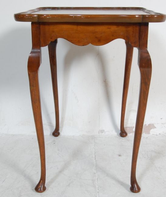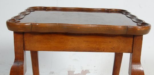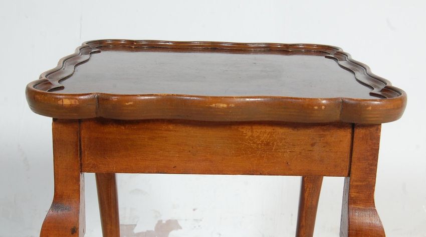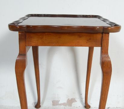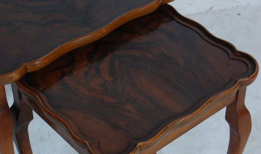 A set of early walnut graduated  nest of table with scrolled edges and shaped leg. Measures, 55 cm H x 52 cm W x 42 cm D