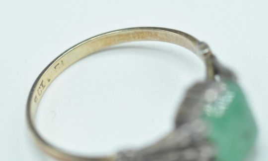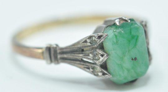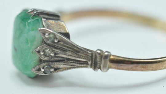 A stamped 9ct gold 1930's Art Deco ring having a 9ct gold band set with a green stone to the centre with white metal shoulders having white accent stones. Band marked 9ct. Weight 1.9g. Size M.5.