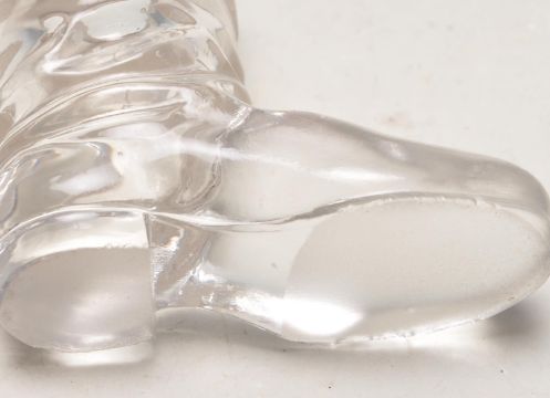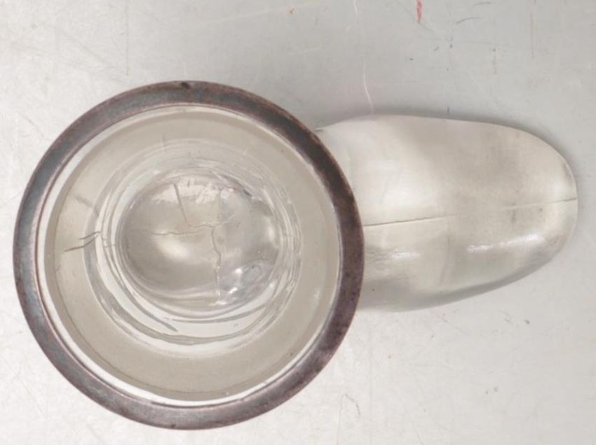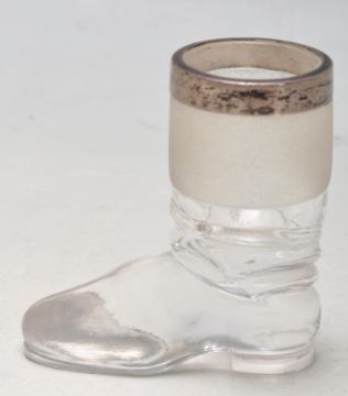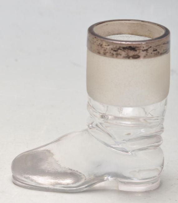 An antique hallmarked sterling silver and glass vesta in the form of a boot having a silver collar with a scratcher to the base and rim. Bearing hallmarks for Birmingham, 1909. Makers mark illegible.