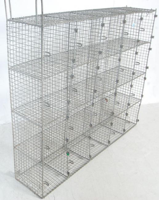 A vintage late 20th century industrial school metal wire mesh pigeon hole storage rack unit having four rows of 5 spaces.