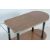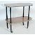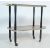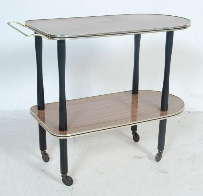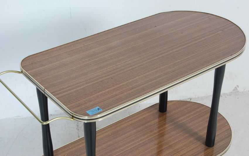 A group of vintage retro 20th century occasional furniture to include a melamine drinks / serving trolley with rounded top tray and undertray wi plastic edges, brass handle, ebonized supports and casters along with a small triangle shape occasional table / coffee table with tapered supports and brass caps, triangular faux leather with ebonized tapered supports and a teak wood frameless wall mirror of an oval form.Measures, 68 cm H x 83 cm W x 38 cm D