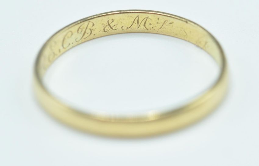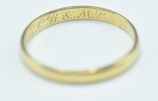 A hallmarked 18ct gold Victorian wedding band ring of D shape, having a plain band, the interior being engraved with initials. Hallmarked London 1890. Weight 1.7g. Size O.